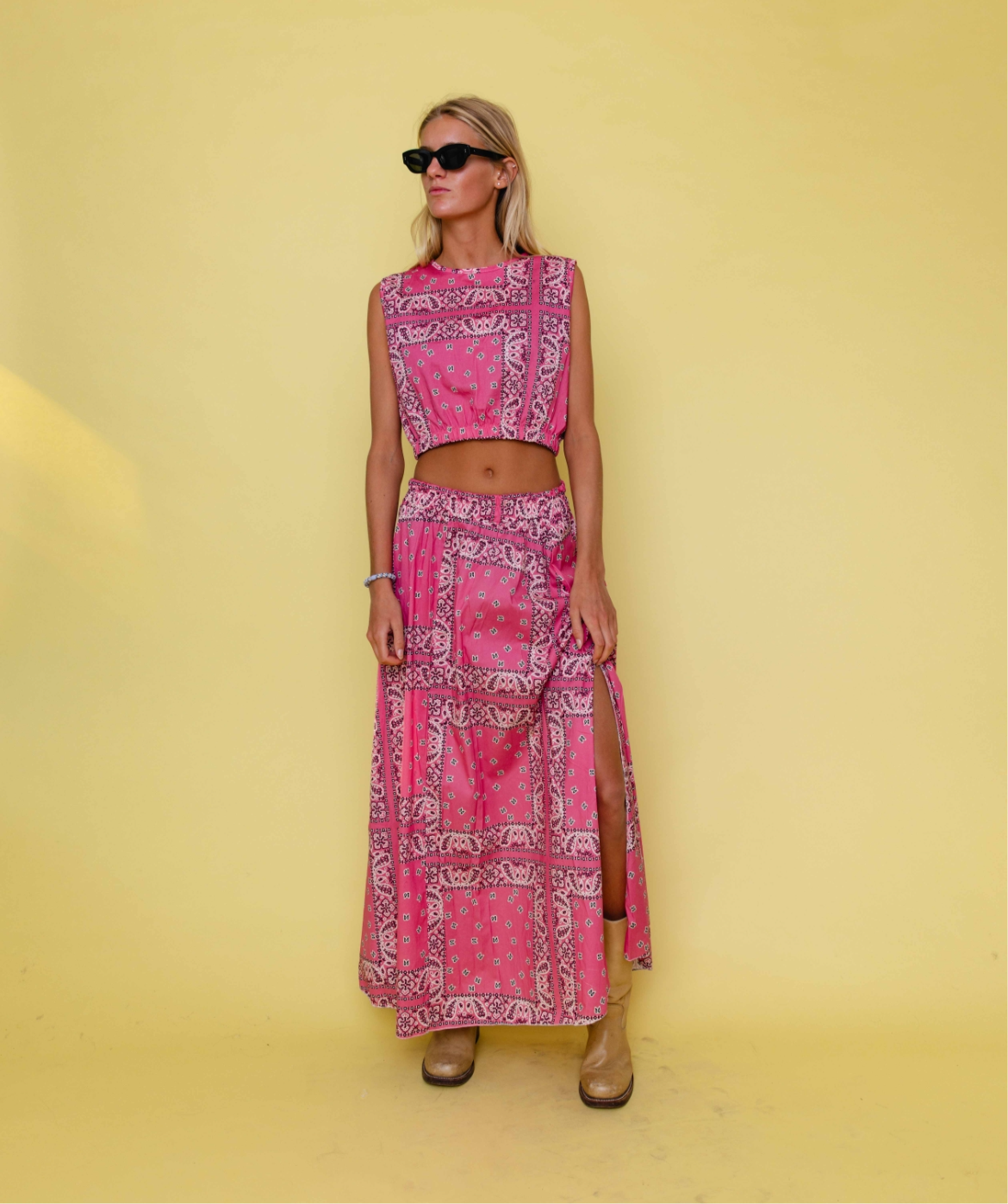 Chic and elegant, this top and skirt set in Italian cotton (97% cotton, 3% elastane) celebrates spring and summer with style.