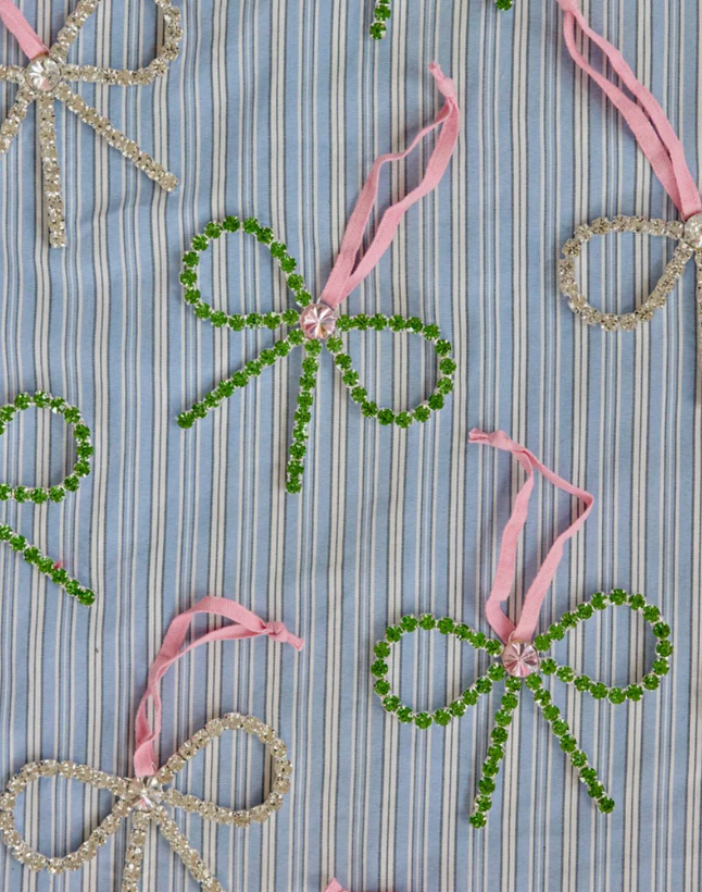 Sprinkle some Christmas magic throughout your home with this beautiful, handmade ornament. It’s shaped like a silver-colored bow and made to add a sparkling touch to your Christmas tree, windows, living room or to a cute table setting.