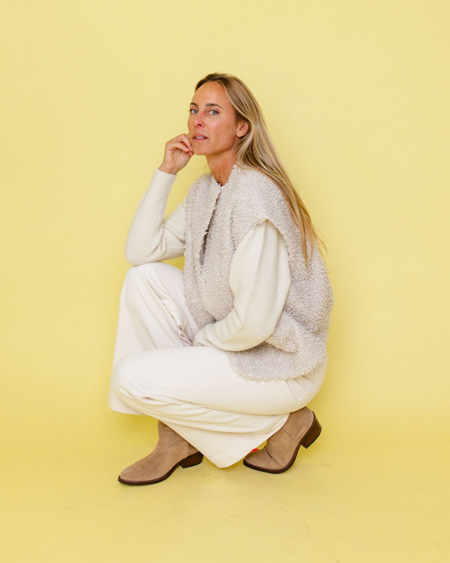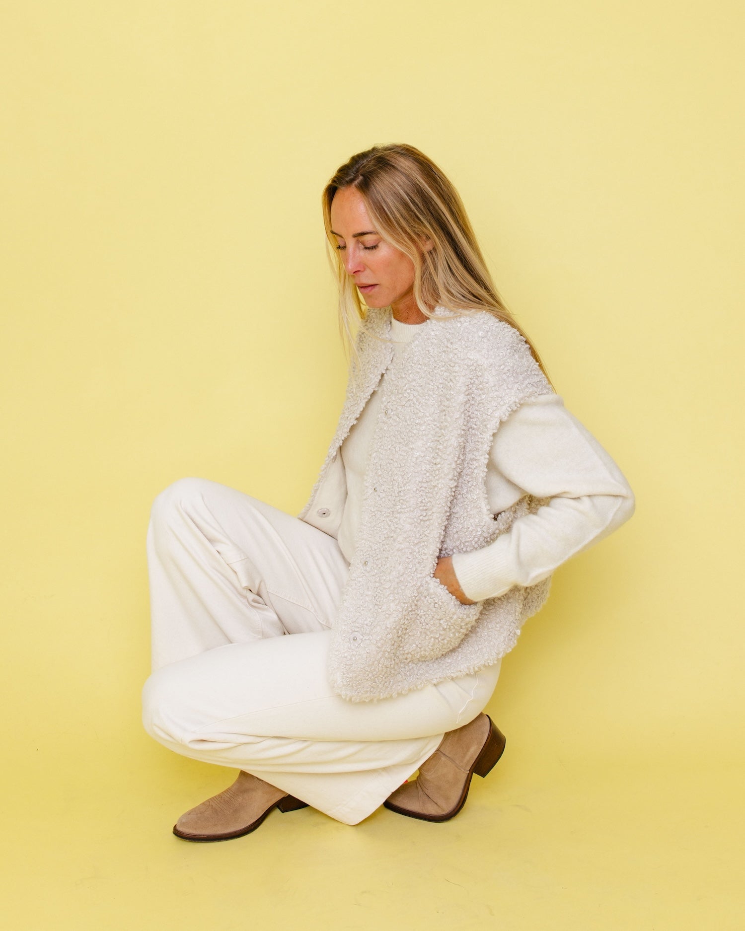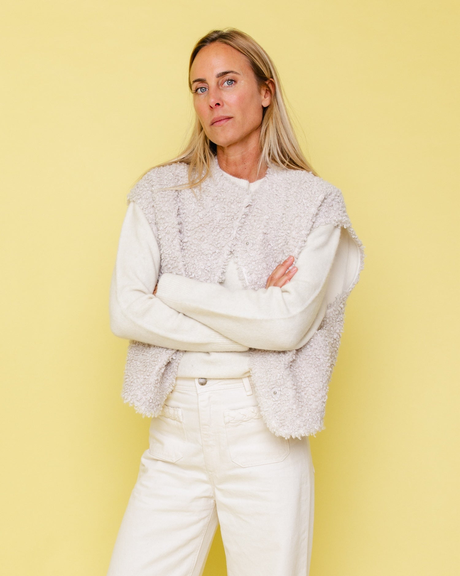 Layering never goes out of style and bodywarmer Joshi proves it with quiet ease. The curly teddy texture and clean neckline add warmth without overwhelming your look. With hidden buttons and deep pockets, it’s as thoughtful as it is soft. Worn over knits, under coats, or styled with a dress, Joshi always fits in.