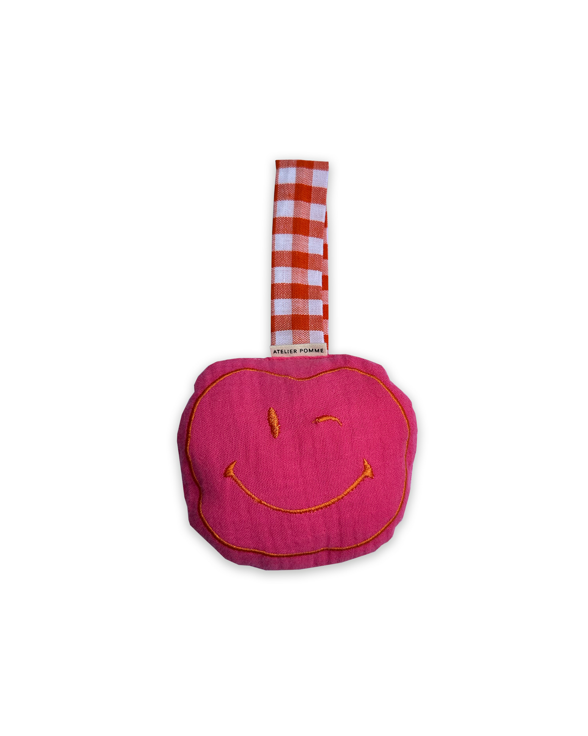 Hi there, my happy friend! Our day one happy maker! A sweet smiley that guards your little ones pacifier. The cuddle is made of soft woolen fabric and has a cord to which you can attach a pacifier. Available in different cheerful colors with a cute print on the back!