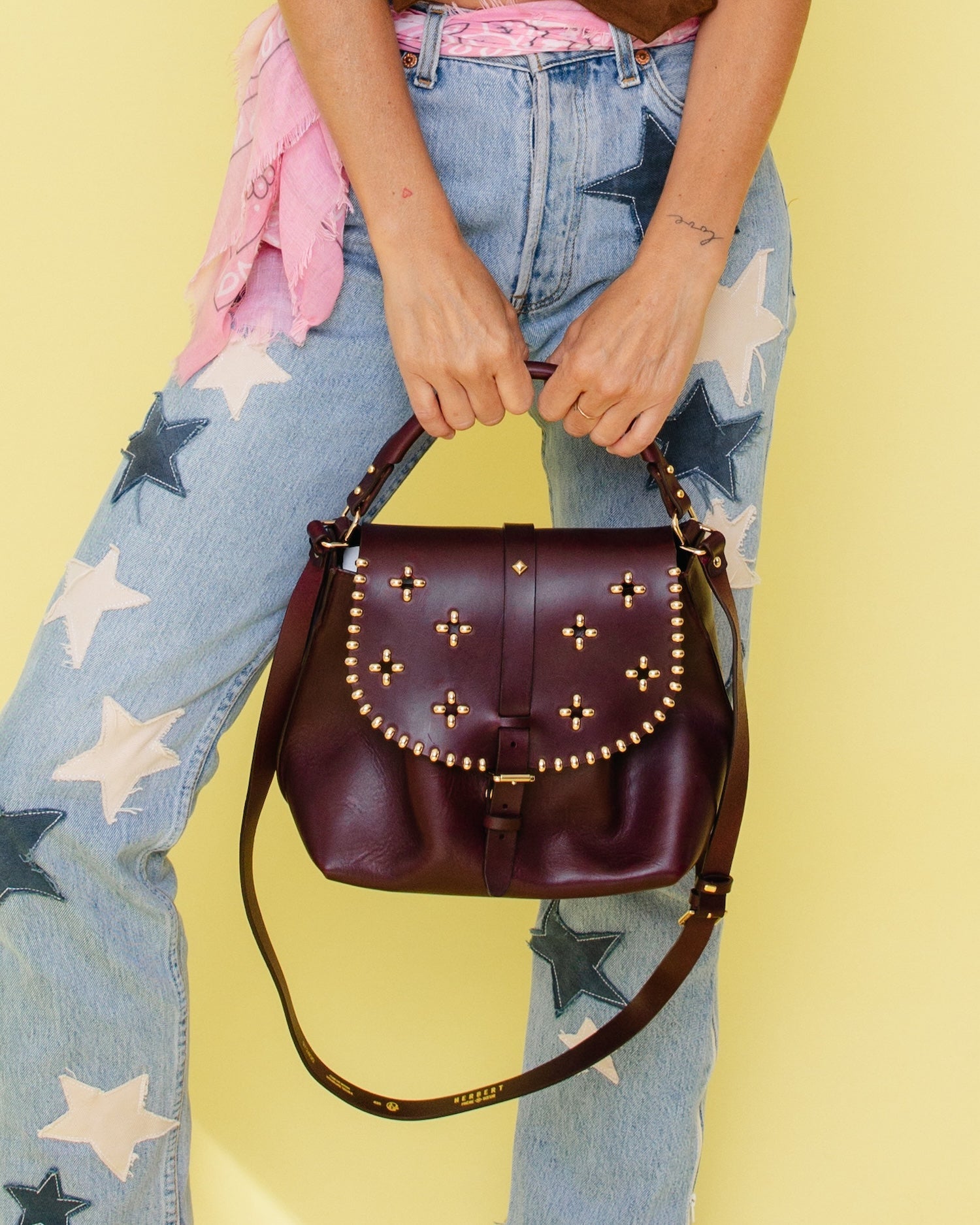 - Eight flowers made of silver studs on the flap of the bag